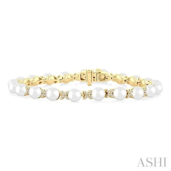 5 MM Cultured Pearl and 1/2 Ctw Round Cut Diamond Floral Fashion Bracelet in 14K Yellow Gold Image 2 Adler's Diamonds Saint Louis, MO