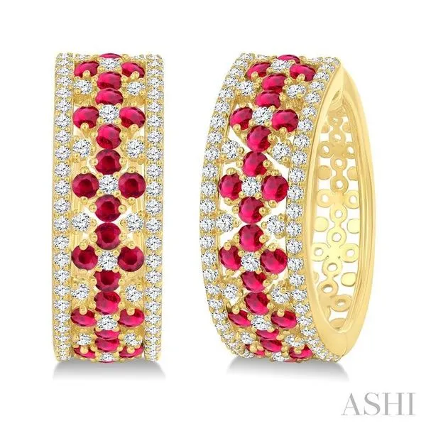 1.80 MM Round Cut Ruby and 3/4 Ctw Round Cut Diamond Precious Hoop Earrings in 14K Yellow Gold Image 2 Adler's Diamonds Saint Louis, MO