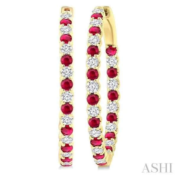 2.3 MM Round Ruby and 1 1/2 Ctw Round Cut Diamond Inside & Outside Alternating Precious Hoop Earrings in 14K Yellow Gold Image 2 Adler's Diamonds Saint Louis, MO