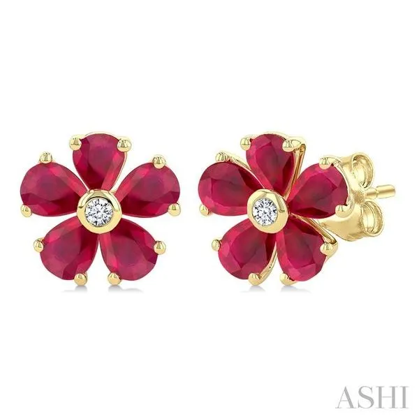 4x3 MM Blossom Pear Shape Ruby and 1/20 Ctw Single Cut Diamond Precious Stud Earrings in 10K Yellow Gold Adler's Diamonds Saint Louis, MO