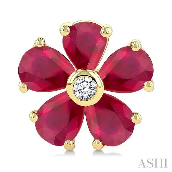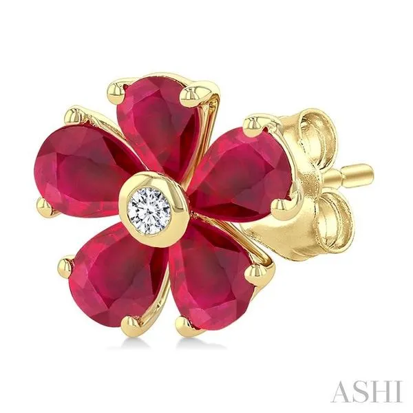 4x3 MM Blossom Pear Shape Ruby and 1/20 Ctw Single Cut Diamond Precious Stud Earrings in 10K Yellow Gold Image 2 Adler's Diamonds Saint Louis, MO