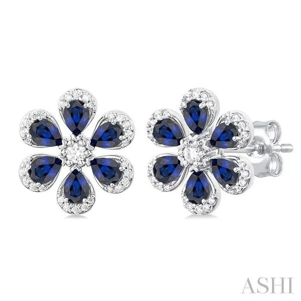 4X3 MM Floral Blossom Pear Cut Sapphire and 1/3 Ctw Round Cut Diamond Precious Stud Earring in 14K White Gold Image 2 Adler's Diamonds Saint Louis, MO