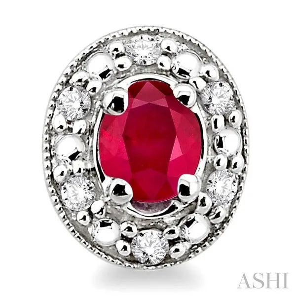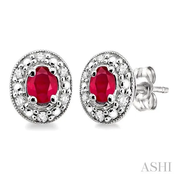 4x3 MM Oval Shaped Ruby and 1/10 Ctw Single Cut Diamond Earrings in 14K White Gold Image 2 Adler's Diamonds Saint Louis, MO