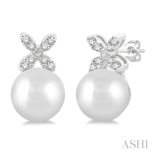 5.5 MM Round Shape Cultured Pearls and 1/20 Ctw Petite 4-Petal Flower Round Cut Diamond Fashion Stud Earring in 10K White Gold Image 3 Adler's Diamonds Saint Louis, MO