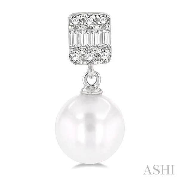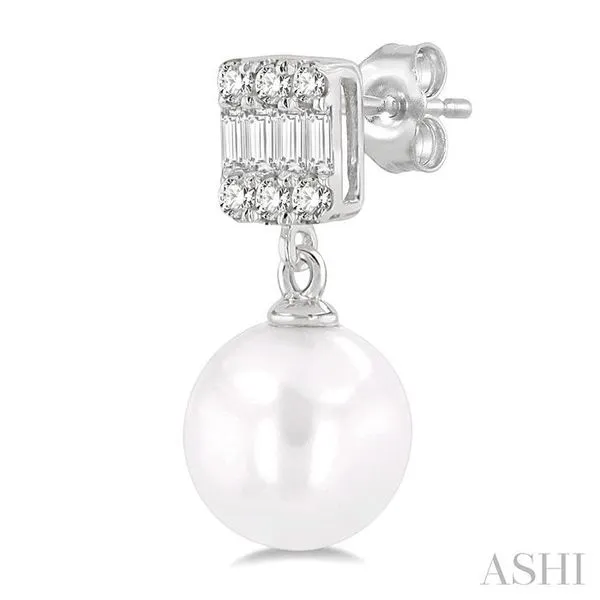 6 MM Cultured Pearls and 1/10 Ctw Baguette and Single Cut Diamond Earrings in 10K White Gold Image 3 Adler's Diamonds Saint Louis, MO