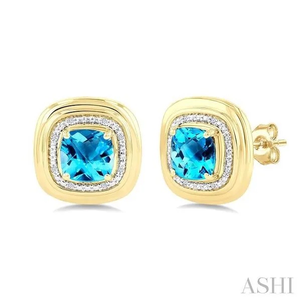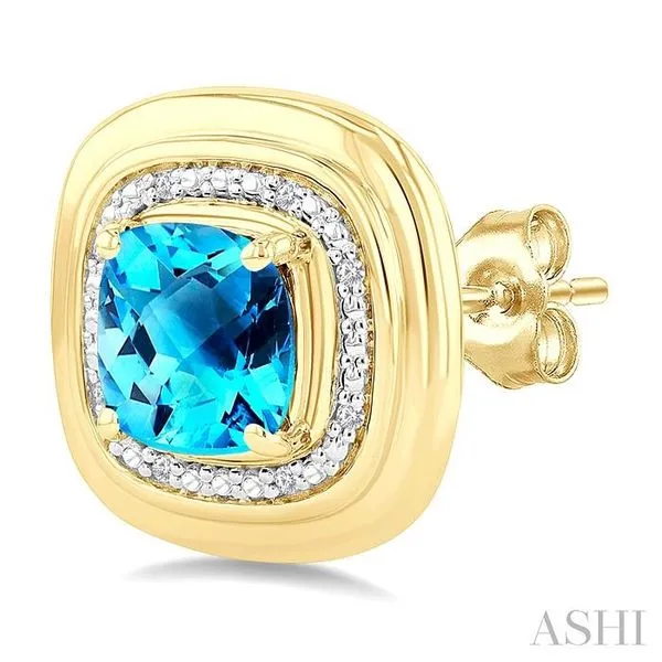 6 MM Cushion Shape Blue Topaz and 1/20 Ctw Round Cut Diamond Semi-Precious Earrings in Yellow Gold Vermeil Image 2 Adler's Diamonds Saint Louis, MO
