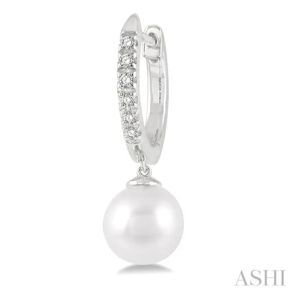 6 MM Round Shape Cultured Pearls and 1/8 Ctw Round Cut Diamond Drop Petite Huggie Earrings 10K White Gold