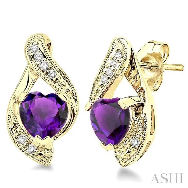 6x6 MM Heart Shape Amethyst and 1/20 Ctw Single Cut Diamond Semi-Precious Earrings in 14K Yellow Gold Image 2 Adler's Diamonds Saint Louis, MO