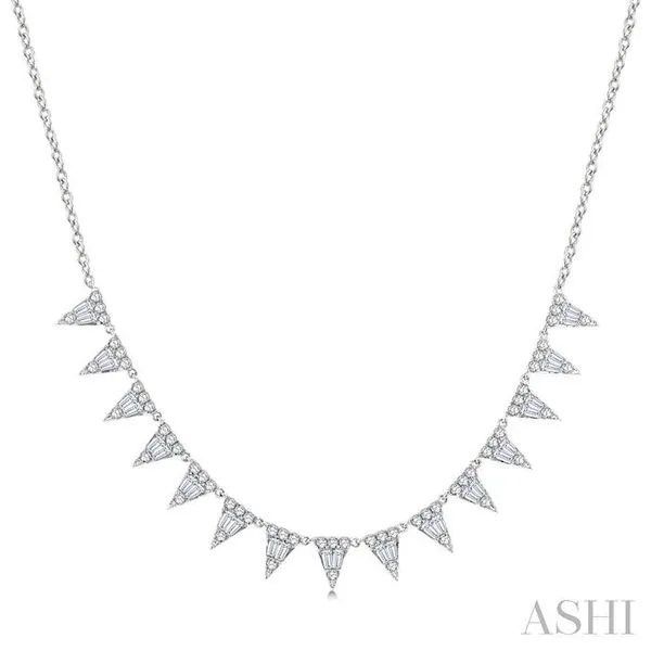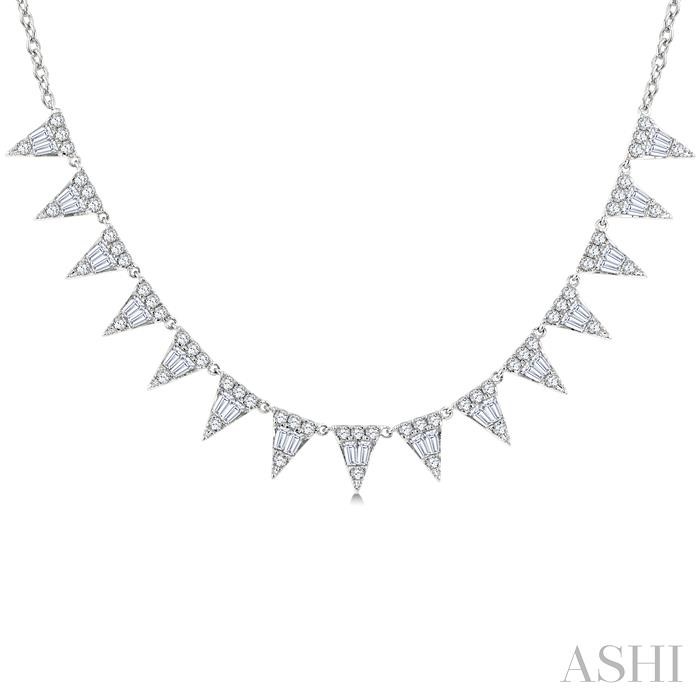1 1/2 Ctw Inverted Triangle Motif Baguette and Round Cut Diamond Necklace in 14K White Gold
