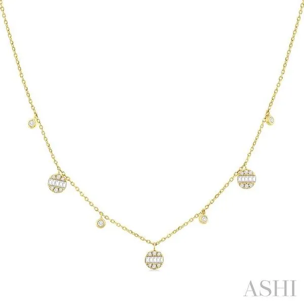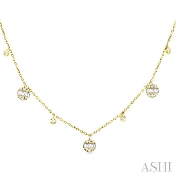1/4 Ctw Danglers Fusion Baguette and Round Cut Diamond Station Necklace in 10K Yellow Gold Adler's Diamonds Saint Louis, MO