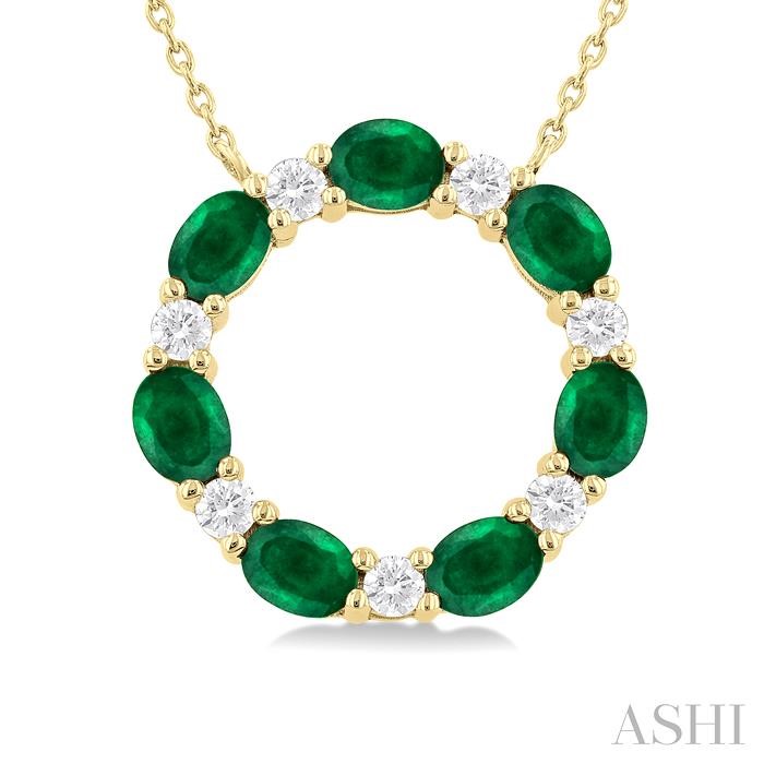 3. 4x3 MM Oval Cut Emerald and 1/4 Ctw Round Cut Diamond Circle Pendant in 14K Yellow Gold