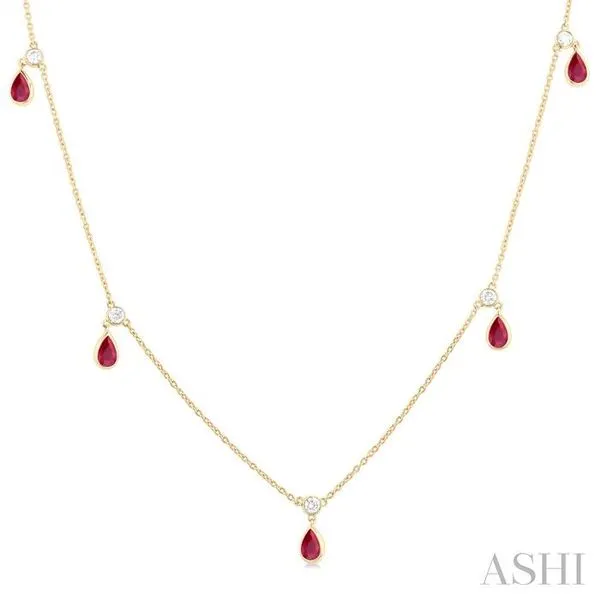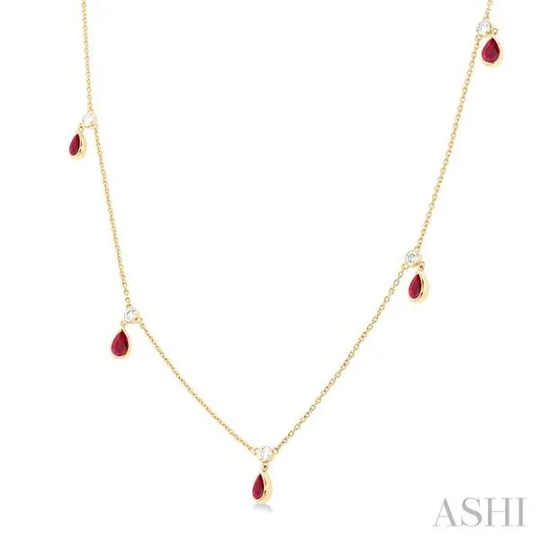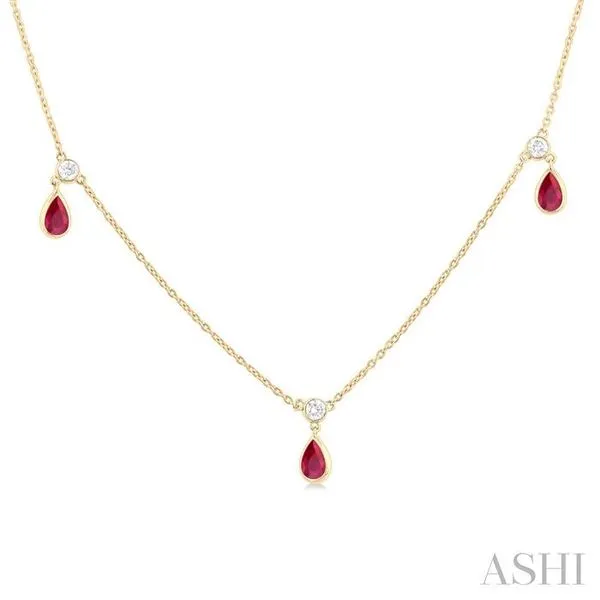 5x3 MM Pear Shape Ruby and 1/4 Ctw Round Cut Diamonds Precious Station Necklace in 14K Yellow Gold Image 2 Adler's Diamonds Saint Louis, MO