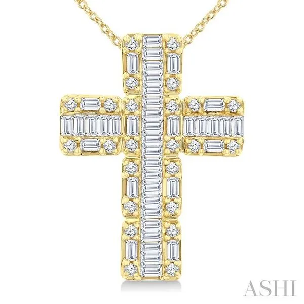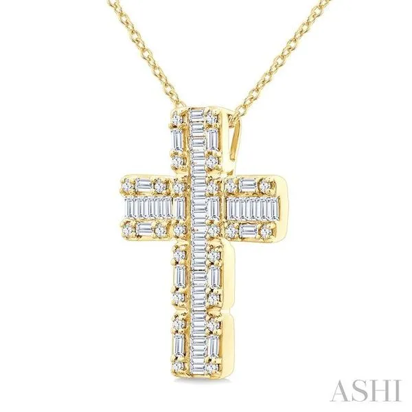 1 Ctw Fusion Baguette and Round Cut Diamond Cross Fashion Pendant With Chain in 14K Yellow Gold Image 2 Adler's Diamonds Saint Louis, MO