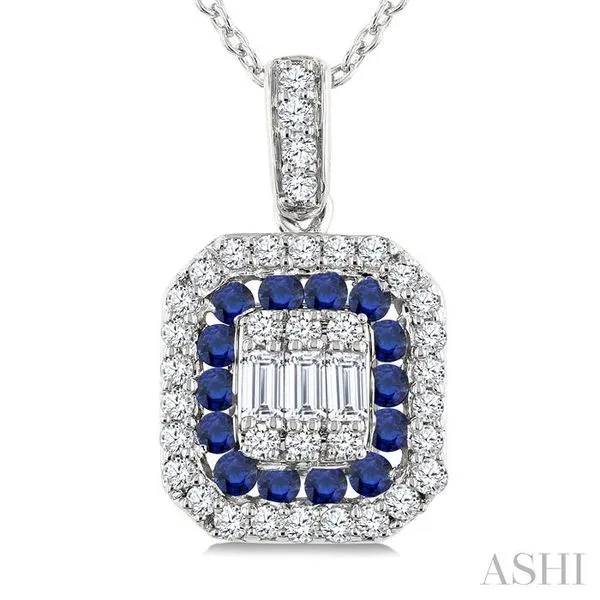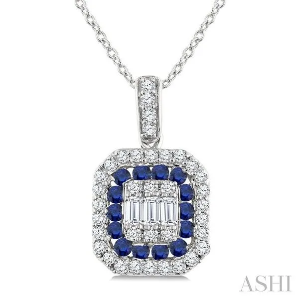 1.45 MM Round Cut Sapphire and 1/4 Ctw Baguette and Round Cut Diamond Precious Pendant With Chain in 14K White Gold Adler's Diamonds Saint Louis, MO