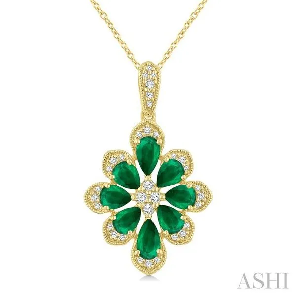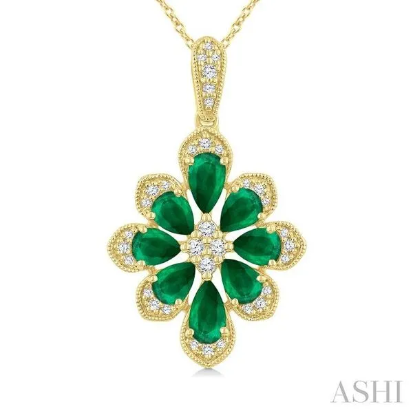 1/6 Ctw Floral Motif 5X3MM & 4X3MM Pear Cut Emerald and Round Cut Diamond Precious Pendant With Chain in 10K Yellow Gold Image 2 Adler's Diamonds Saint Louis, MO