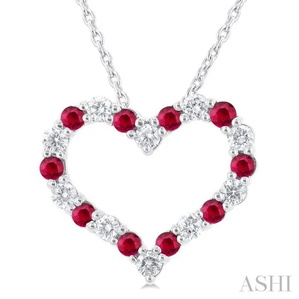 1.80 MM Round Cut Ruby and 1/4 Ctw Open Heart Round Cut Diamond Precious Fashion Pendant With Chain in 14K White Gold Adler's Diamonds Saint Louis, MO