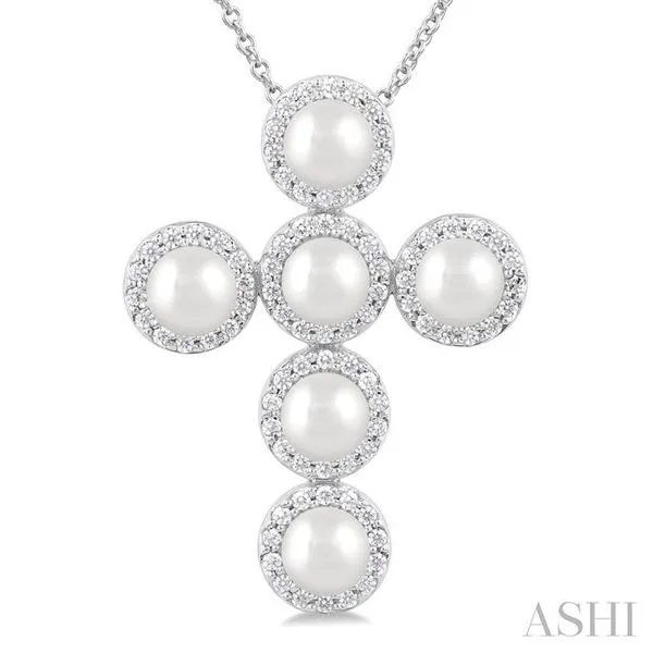 4 MM Cross Cultured Pearl and 1/3 Ctw Round Cut Diamond Pendant With Chain in 14K White Gold Image 2 Adler's Diamonds Saint Louis, MO