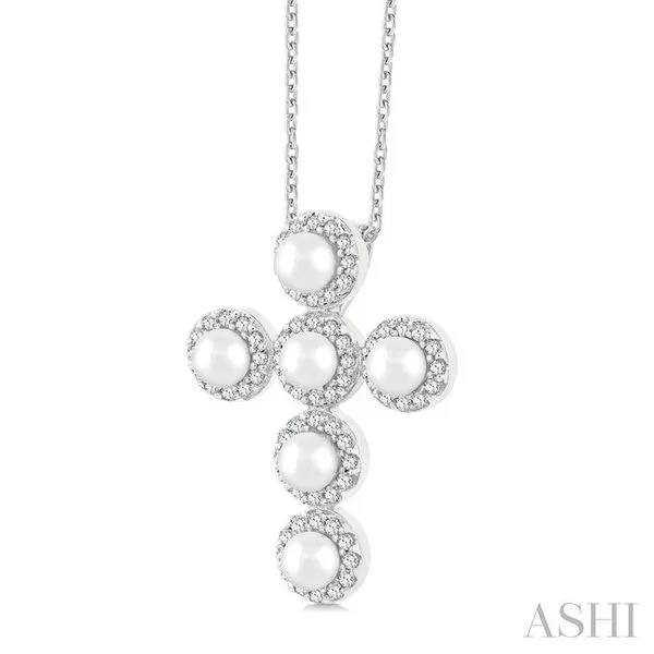 4 MM Cross Cultured Pearl and 1/4 Ctw Round Cut Diamond Pendant With Chain in 14K White Gold Image 2 Adler's Diamonds Saint Louis, MO