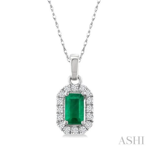 5x3 MM Octagonal Shape Emerald and 1/20 Ctw Single Cut Diamond Halo Precious Pendant with Chain in 10K White Gold Image 2 Adler's Diamonds Saint Louis, MO