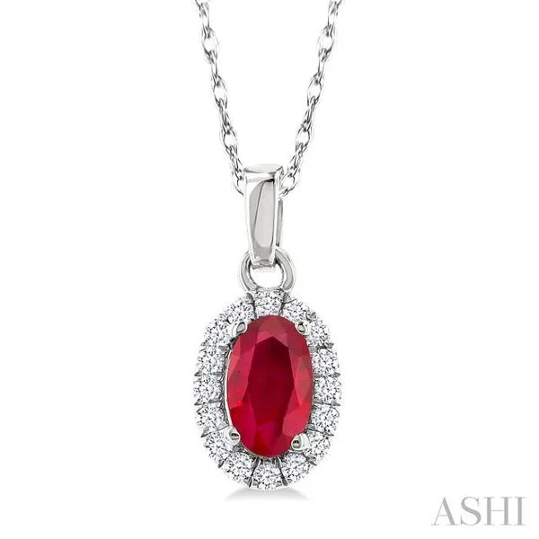 5x3 MM Oval Shape Ruby and 1/20 Ctw Single Cut Diamond Halo Precious Pendant with Chain in 10K White Gold Image 2 Adler's Diamonds Saint Louis, MO