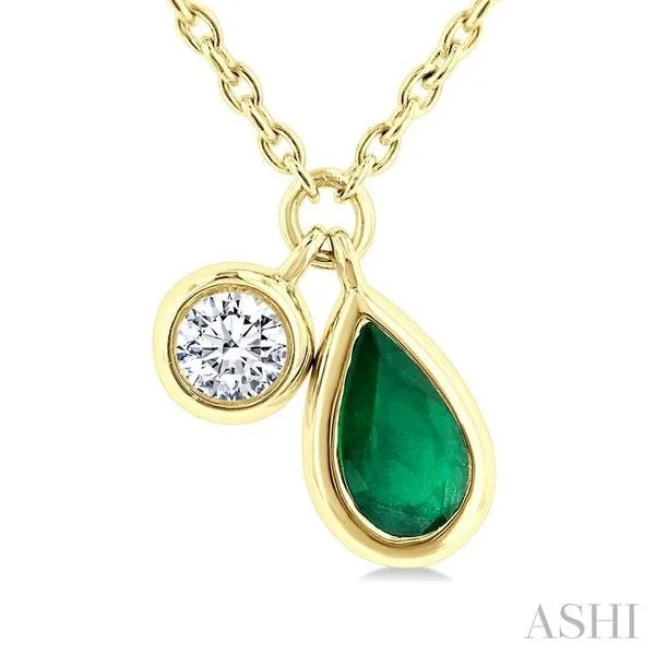 5x3 MM Pear Cut Emerald and 1/50 Ctw Bezel Set Round Cut Diamond Precious Pendant With Chain in 10K Yellow Gold Adler's Diamonds Saint Louis, MO