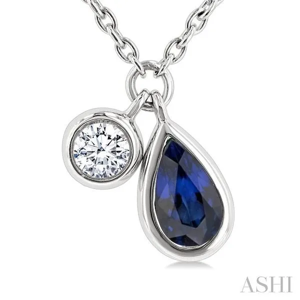 5x3 MM Pear Cut Sapphire and 1/50 Ctw Bezel Set Round Cut Diamond Precious Pendant With Chain in 10K White Gold Adler's Diamonds Saint Louis, MO