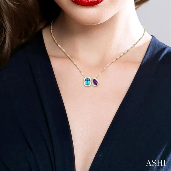 (314) 394-20866X4 MM Emerald Cut Blue Topaz and Pear Cut Amethyst and 1/5 Ctw Toi Et Moi Round Cut Diamond Halo Fashion Pendant With Chain in 14K Yellow Gold