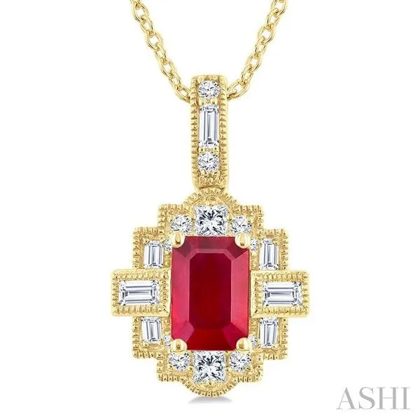 6X4 MM Octagon Shape Ruby and 1/4 Ctw Round and Baguette Cut Diamond Precious Pendant With Chain in 14K Yellow Gold Image 2 Adler's Diamonds Saint Louis, MO