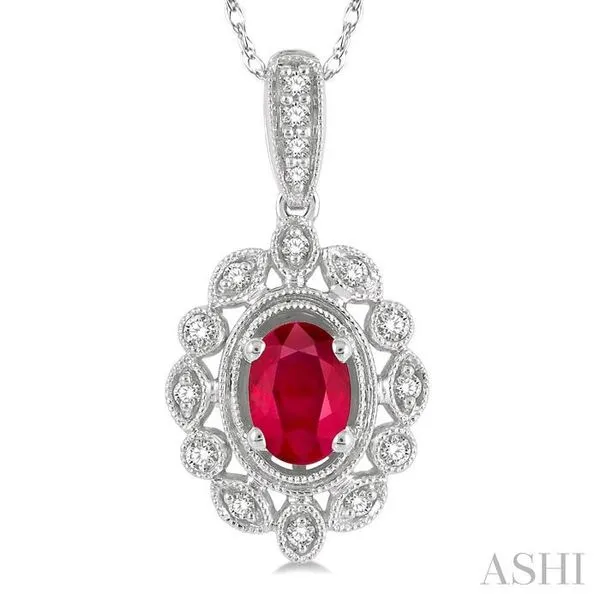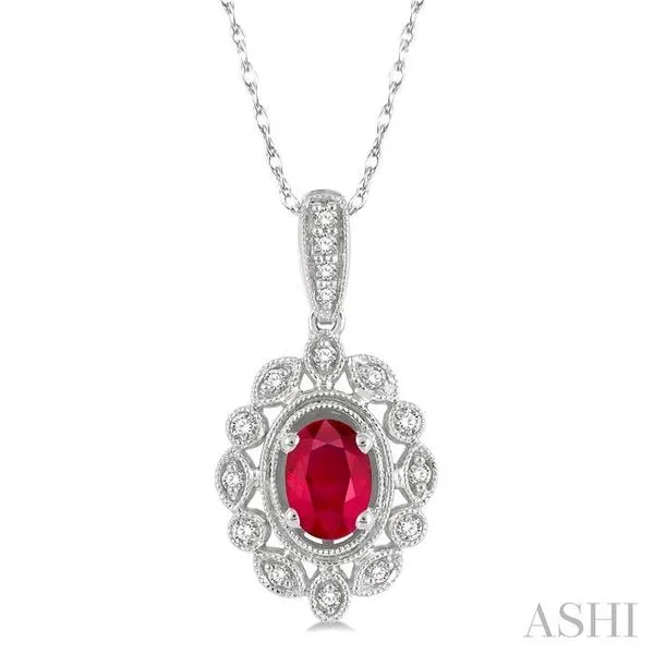 6x4 MM Oval Cut Ruby and 1/8 Ctw Lattice Round Cut Diamond Precious Pendant With Chain in 10K White Gold Image 2 Adler's Diamonds Saint Louis, MO