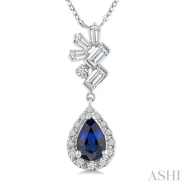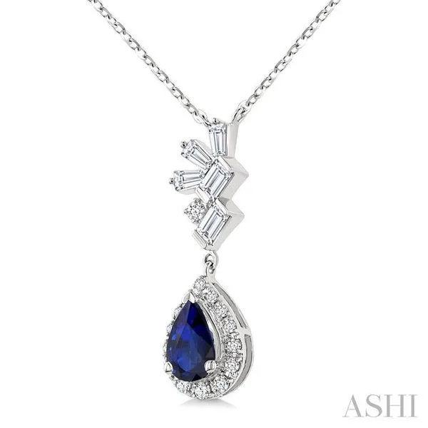 6X4MM Pear Cut  Sapphire, Round and 1/4 Ctw  Baguette Cut Scatter Diamond Precious Fashion Pendant With Chain in 10K White Gold Image 2 Adler's Diamonds Saint Louis, MO