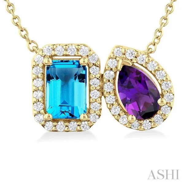 (314) 394-20867X5 MM Emerald Cut Blue Topaz & Pear Cut Amethyst and 1/4 Ctw Toi Et Moi Round Cut Diamond Pendant With Chain in 14K Yellow Gold