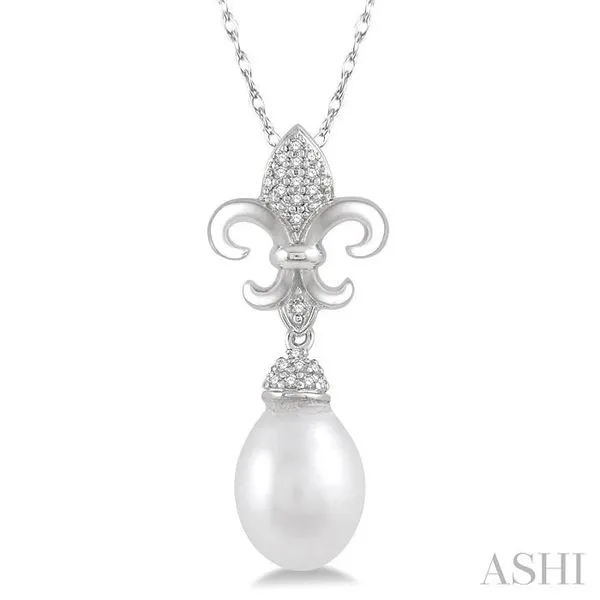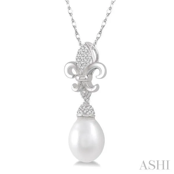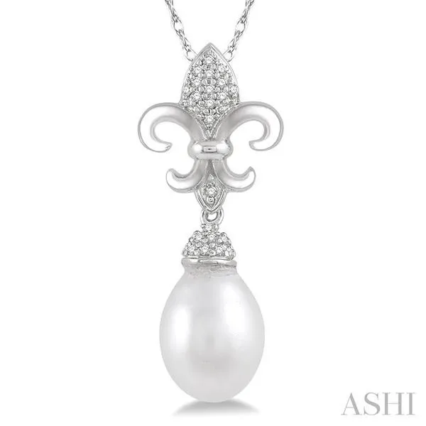 9X7 MM Drop Shape Cultured Pearl and 1/10 Ctw Round Cut Diamond Fleur De Lis Pendant With Chain in 10K White Gold Adler's Diamonds Saint Louis, MO