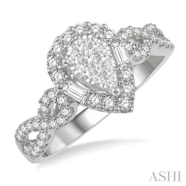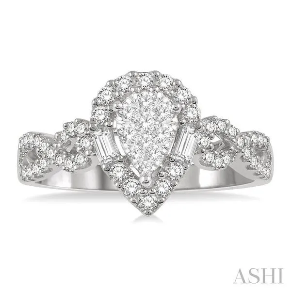 1/2 Ctw Pear Shape Bow Shank Lovebright Round and Baguette Diamond Ring in 14K White gold