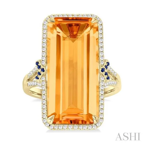 (314) 394-208622x10 MM Emerald Cut Citrine and 0.80 MM Round Sapphire & 1/4 Ctw Round Cut Diamond Halo Precious & Semi-Precious Ring in 14K Yellow Gold