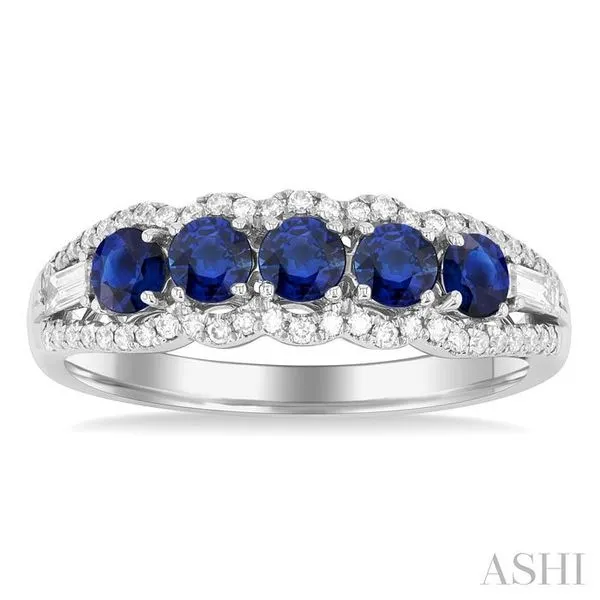 3.1 MM Round Sapphire and 1/4 Ctw Baguette and Single Cut Diamond 5-Stone Precious Ring in 14K White Gold Adler's Diamonds Saint Louis, MO