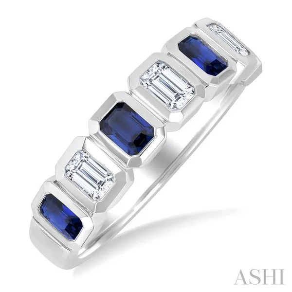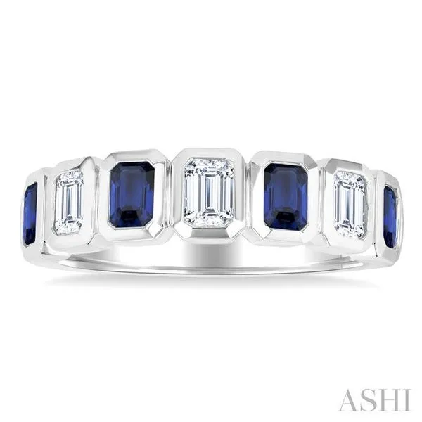 4X3 MM Octagon Shape Sapphire and 5/8 Ctw Emerald Cut Diamond 7-Stone Bezel Set Precious Fashion Band in 14K White Gold Image 2 Adler's Diamonds Saint Louis, MO