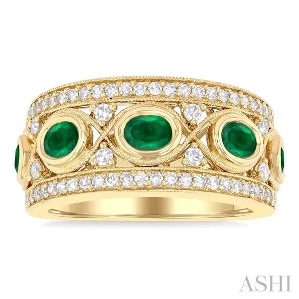 4x3 MM Oval and 2.8 MM Round Cut Emerald and 3/8 Ctw Curvy Criss Cross Single Cut Diamond Precious Band in 14K Yellow Gold Image 2 Adler's Diamonds Saint Louis, MO