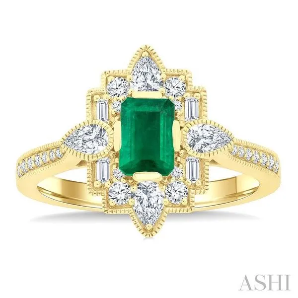 6X4 MM Octagon Cut Emerald and 5/8 Ctw Art Deco Mixed Diamond Cut Precious Fashion Ring in 14K Yellow Gold Image 2 Adler's Diamonds Saint Louis, MO