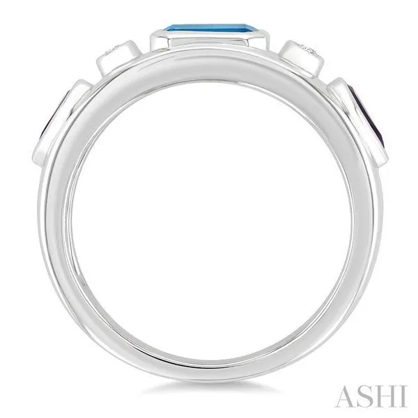 (314) 394-20866x4 MM Octagon Shape Blue Topaz & 5x3 MM Pear Shape Amethyst and 1/20 Ctw Round Cut Diamond Semi-Precious Ring in Sterling Silver